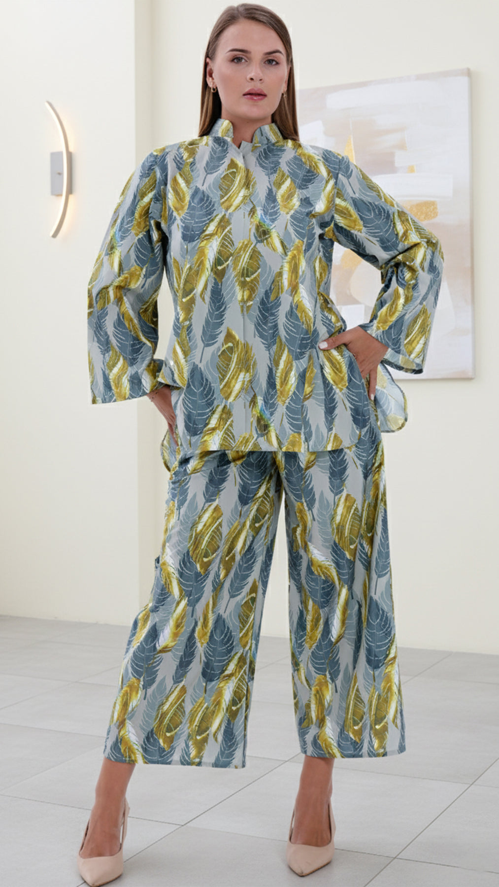 • Fit: Relaxed silhouette with a fluid top and wide-leg pants for all-day comfort.