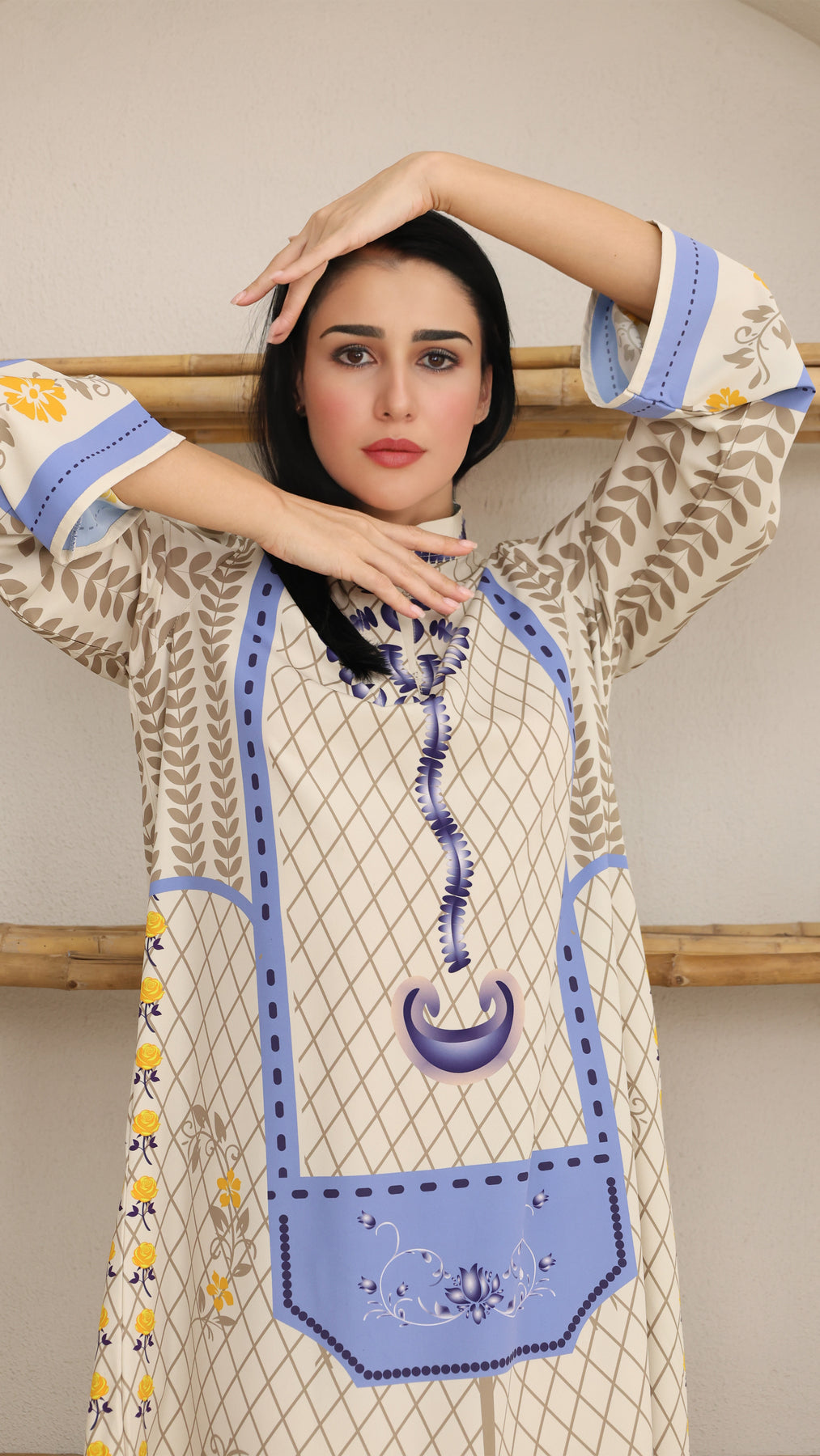 Slip into luxe ease with this kaftan—designed to blend comfort with quiet sophistication. Crafted from premium breathable fabric suitable for all seasons, it drapes beautifully with a soft sheen and breathable feel that moves with you.