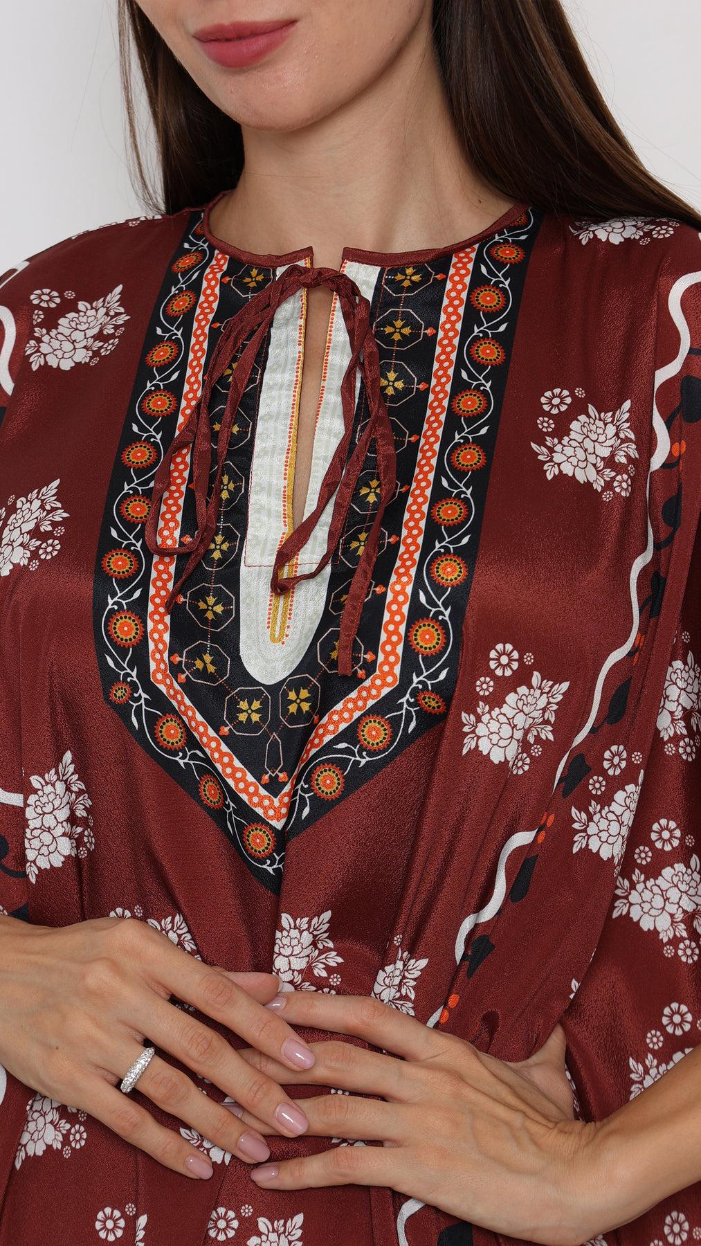 Make an effortless impression with this exquisite kaftan, showcasing a deep rust base adorned with intricate white florals and a geometric yoke design. The airy fabric cascades beautifully, creating a dramatic silhouette and an overall luxurious feel that makes it your go-to for any occasion.